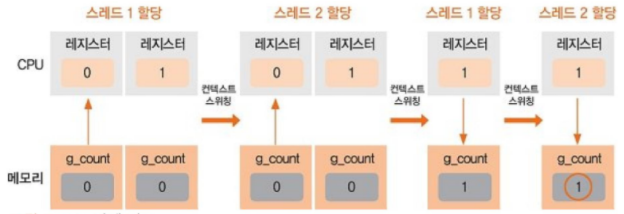 - 경쟁 조건(race condition) : 스레드 여러 개가 공유 자원에 동시에 접근하는 것